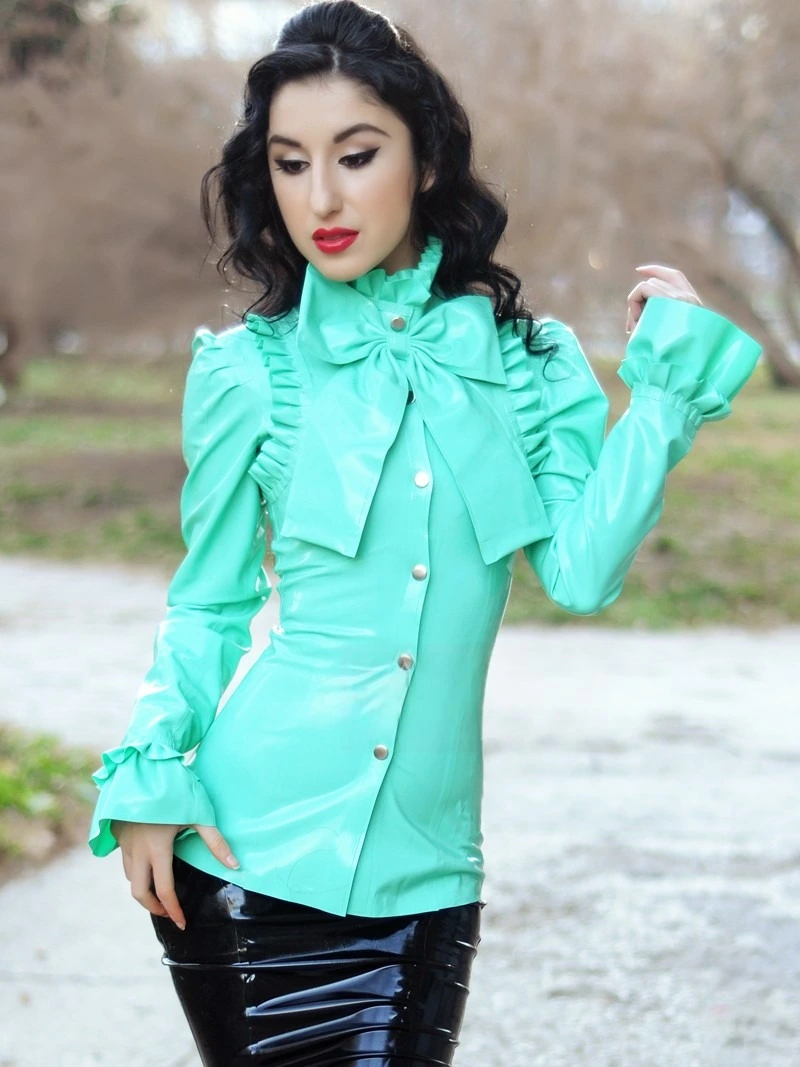 Tight-fitting contoured hip-length shirt with front stud buttons as shown;