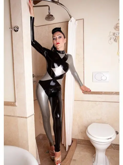 This latex bodysuit is made of high-gloss latex material, featuring a geometric paneled design in black and silver. Clean line divisions create a futuristic and fashionable appeal.