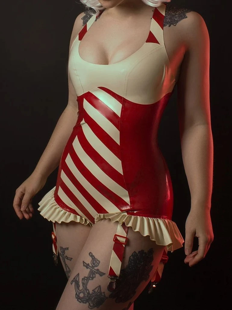 Latex Christmas candy cane lingerie, this short frilly edge latex bodysuit features bold stripes detailing on the front panel and integral matching suspenders.