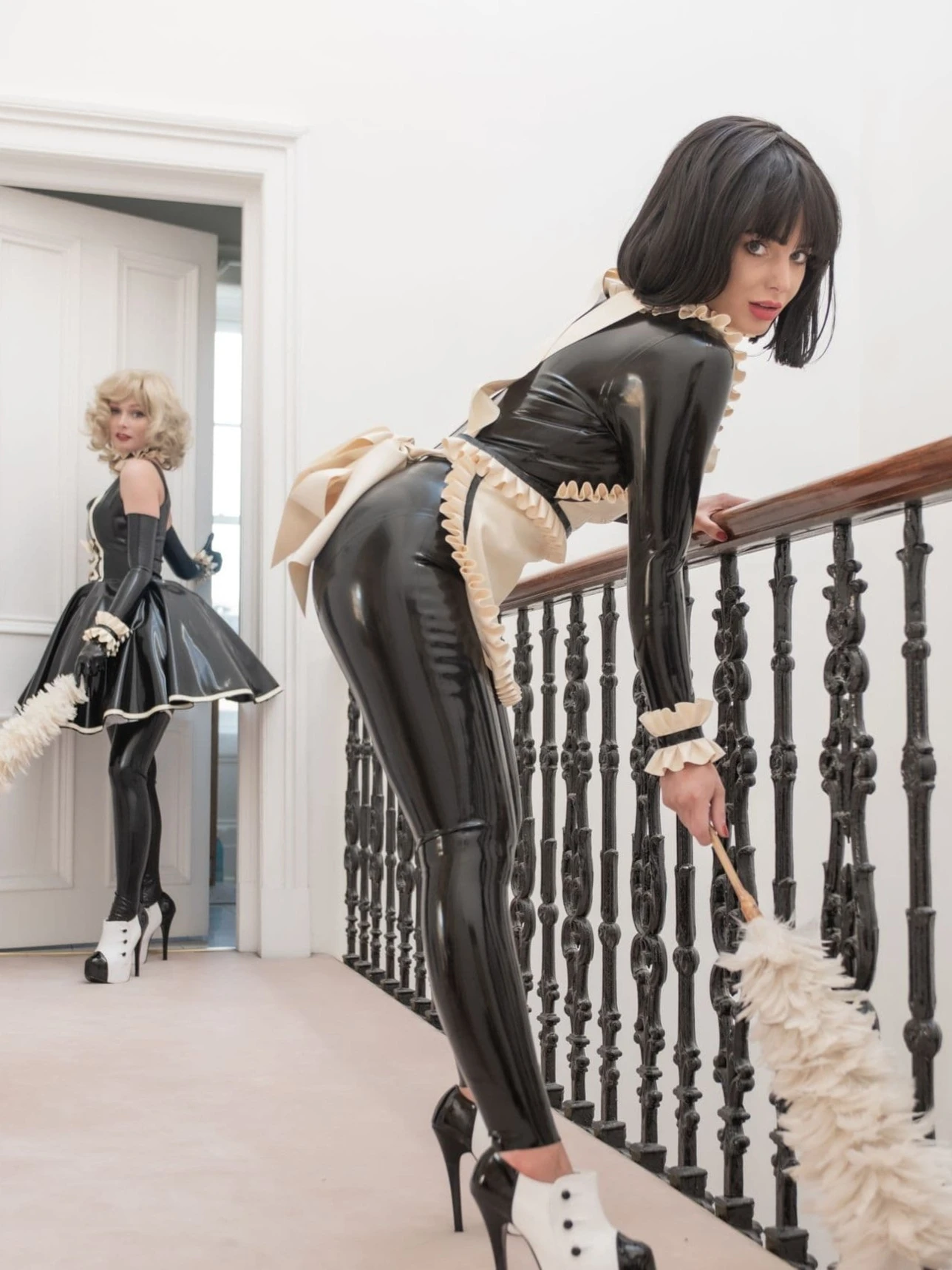 Our complete maids Catsuit outfit consists of a frilled scoop neck catsuit which has a 4cm friilled scoop neck and concealed rear 3 way crotch zip.