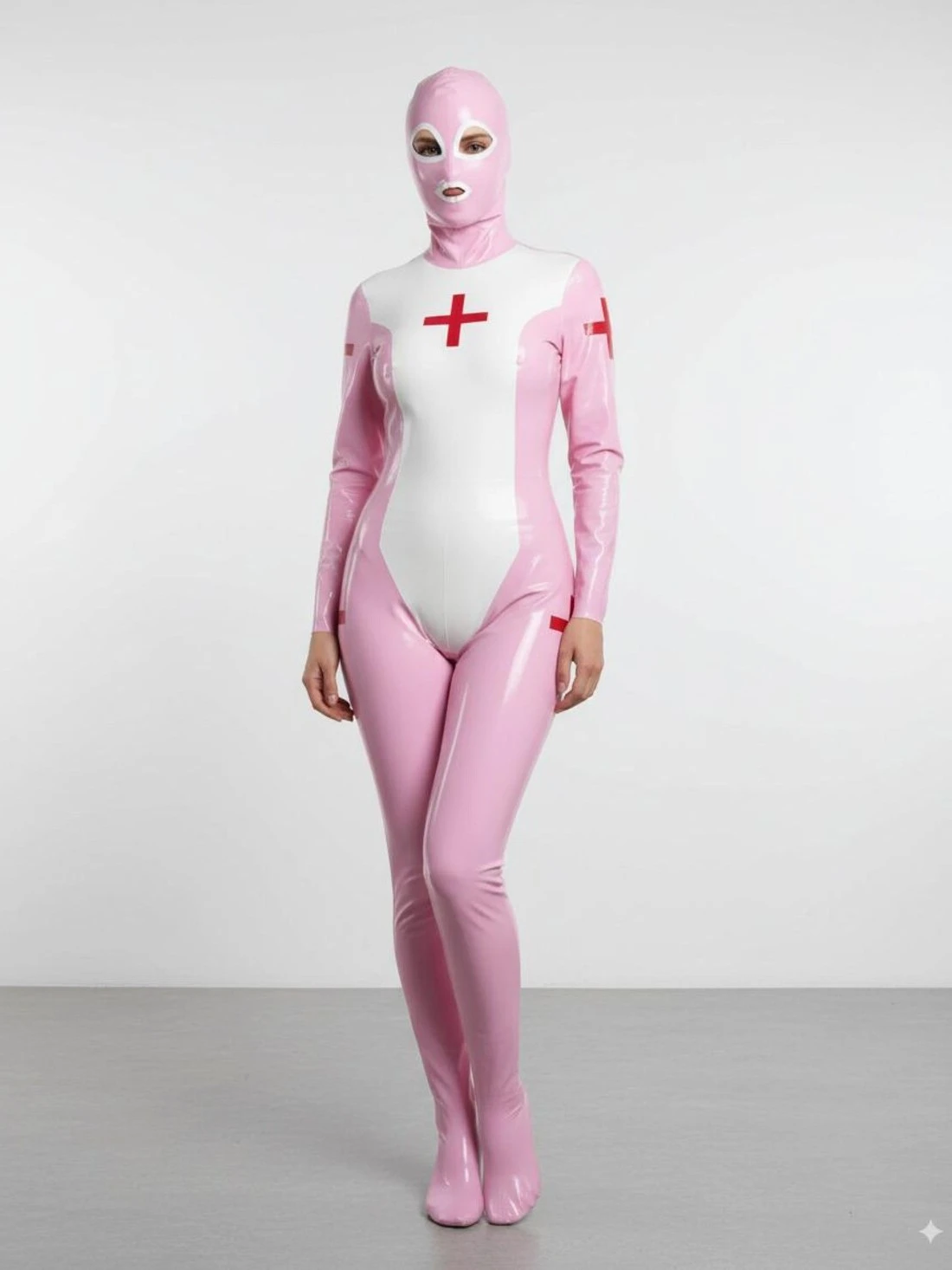 Latex Rubber Cosplay Nurse Catsuit Bodysuit With Mask