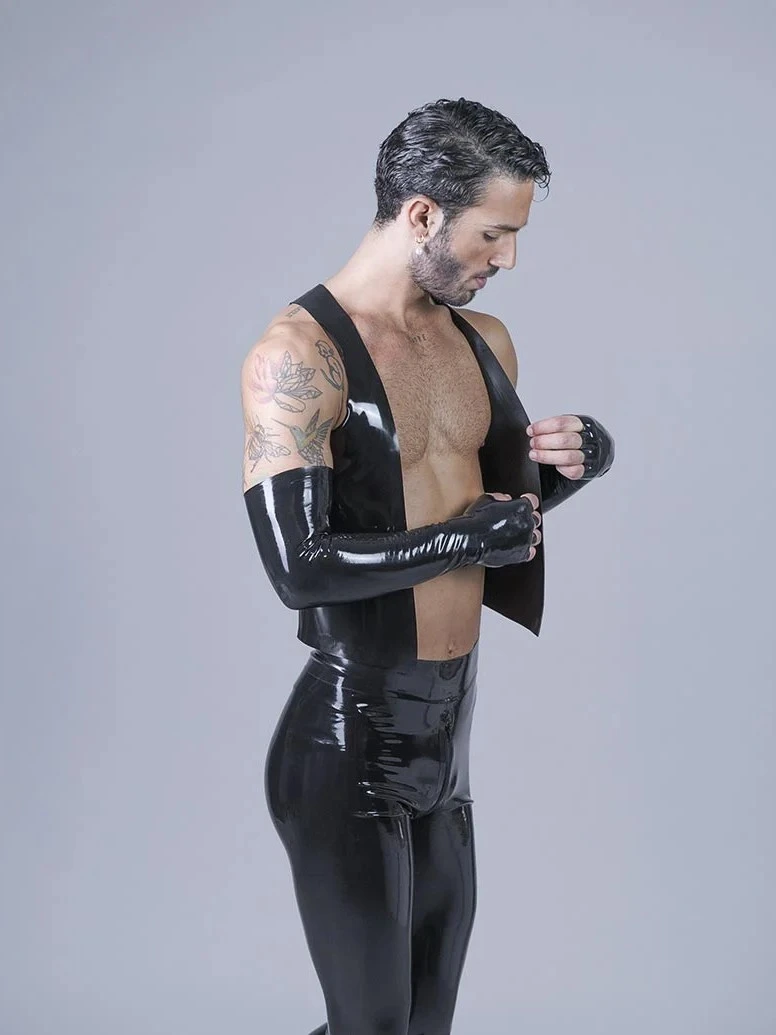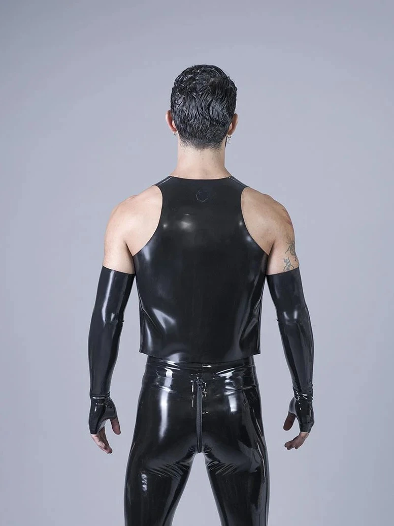 Latex waistcoat, slim cut with inner pockets and trims along the shoulders and the sides