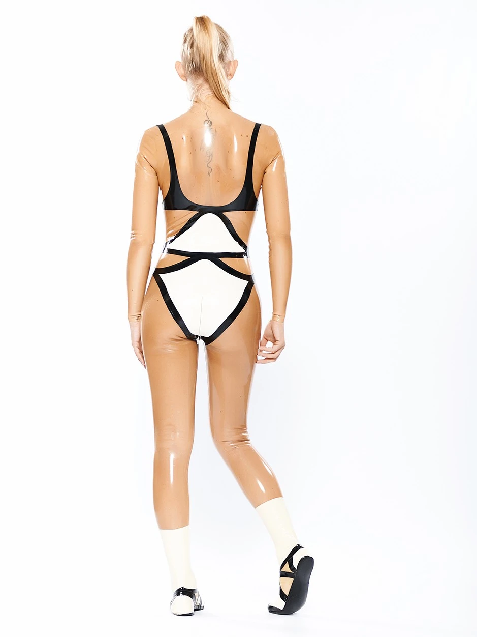 This high-gloss transparent latex catsuit hugs the body for a striking silhouette. White geometric panels with black trim create a bold contrast, giving a futuristic and stylish look. High-cut waist and leg openings enhance the shape of your legs. Perfect for parties, photo shoots, or high-fashion statements.