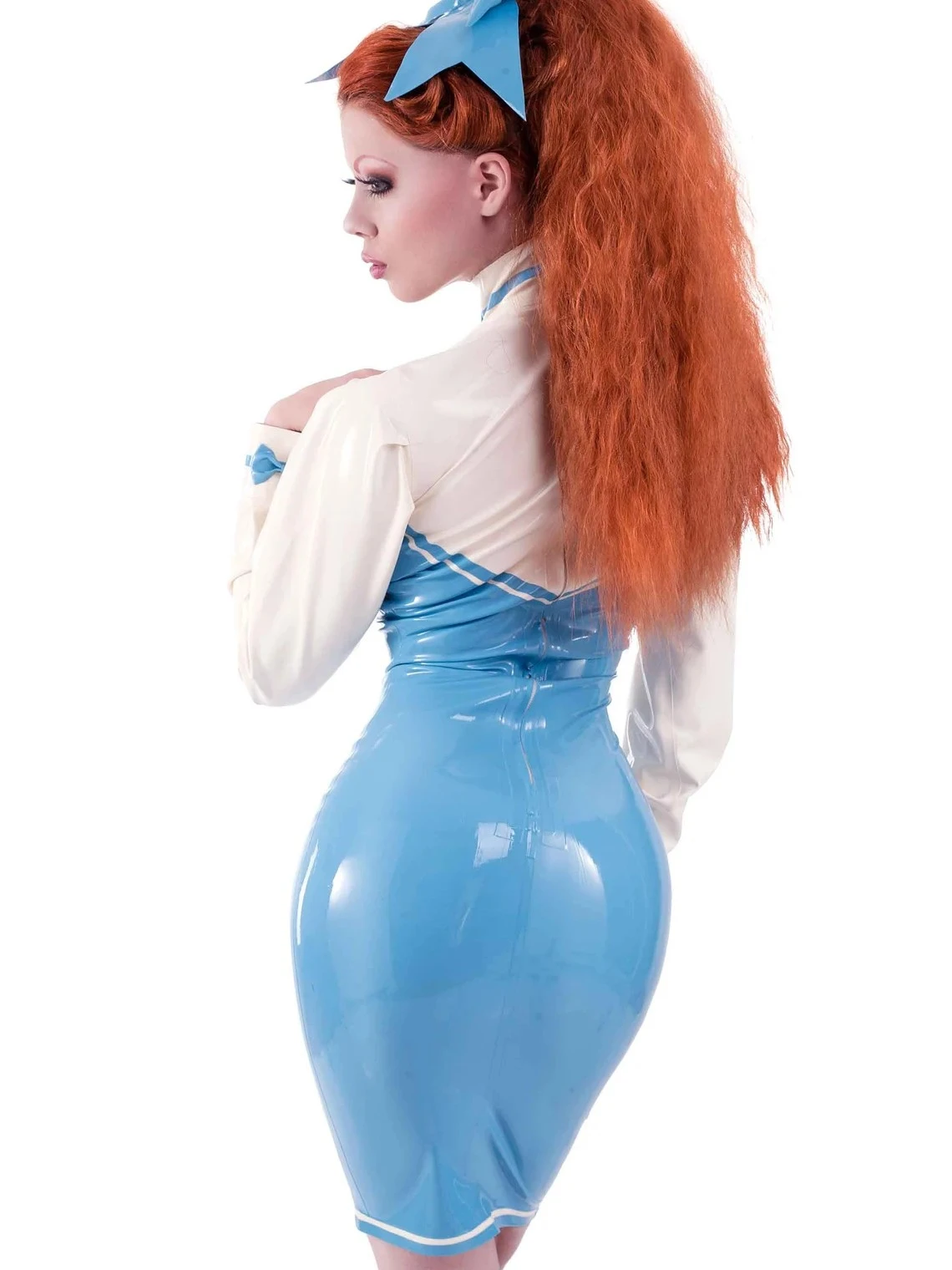It has a classic Mistress high neck with gorgeous full length bishop sleeves which are cutely finished with beautiful delicate rubber bows.